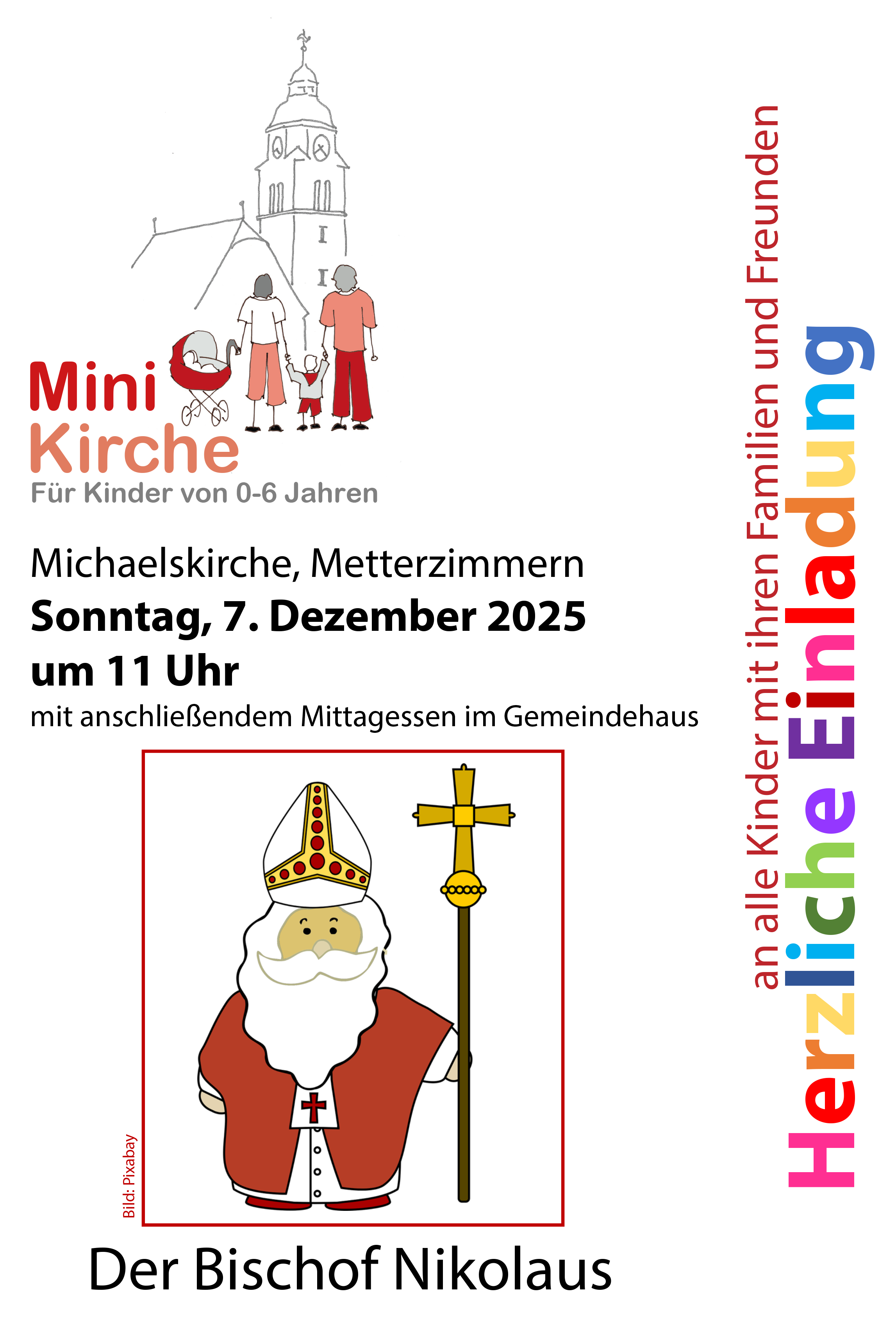 Die Minikirche ist ein kleiner Gottesdienst für Klein- und Vorschulkinder mit ihren Familien und Freunden. Etwa eine halbe Stunde lang erzählen und spielen wir Geschichten, singen und beten gemeinsam und haben viel Freude dabei. Nach dem Gottesdienst gibt es für alle ein leckeres Mittagessen im Gemeindehaus.